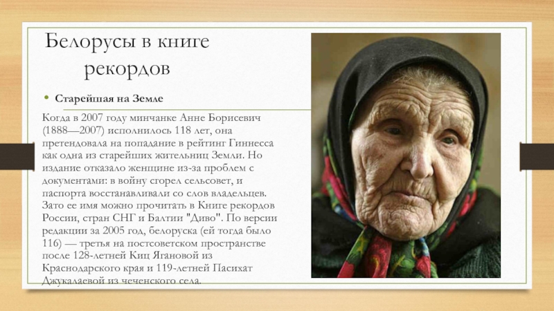 Борисевич (1888—2007) исполнилось 118 лет, она претендовала на попадание в рейтинг Гиннесса как одна из старейших жительниц Земли. Но издание отказало женщине из-за проблем с документами: в войну сгорел сельсовет, и паспорта восстанавливали со слов владельцев. Зато ее имя можно прочитать в Книге рекордов России, стран СНГ и Балтии "Диво". По версии редакции за 2005 год, белоруска (ей тогда было 116) — третья на постсоветском пространстве после 128-летней Киц Ягановой из Краснодарского края и 119-летней Пасихат Джукалаевой из чеченского села.