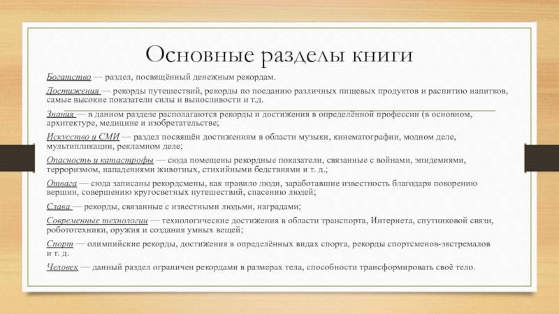 Первоначально «Книга рекордов Гиннесса» включала проверенные научные факты, собранные братьями Мак-Уайртерами, но со временем в Книге стало появляться всё больше странных и экстравагантных достижений различных людей.