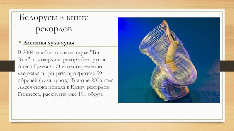 подтвердила рекорд белоруска Алеся Гулевич. Она одновременно удержала и три раза прокрутила 99 обручей (хула-хупов). В июне 2006 года Алеся снова попала в Книгу рекордов Гиннесса, раскрутив уже 101 обруч.