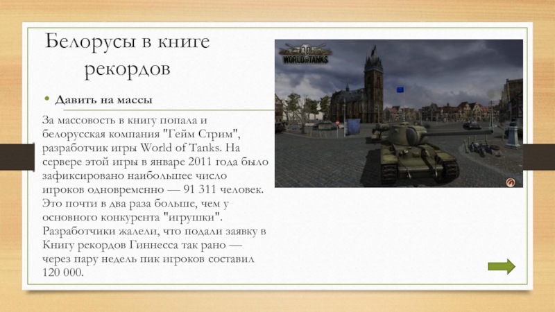 белорусская компания "Гейм Стрим", разработчик игры World of Tanks. На сервере этой игры в январе 2011 года было зафиксировано наибольшее число игроков одновременно — 91 311 человек. Это почти в два раза больше, чем у основного конкурента "игрушки". Разработчики жалели, что подали заявку в Книгу рекордов Гиннесса так рано — через пару недель пик игроков составил 120 000.