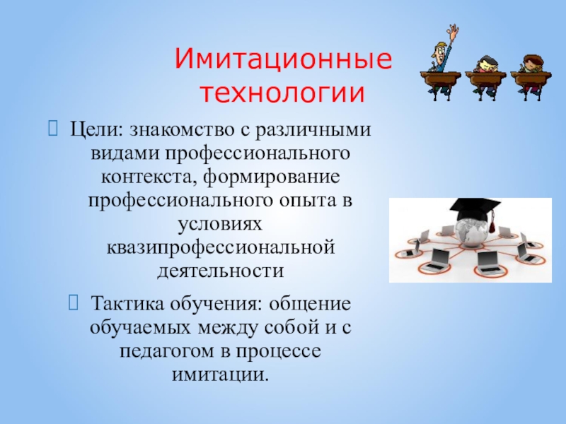 В основе имитационных технологий лежит имитационное или имитационно - игровое моделирование, т. е. воспроизведение в условиях обучения с той или иной мерой адекватности процессов, происходящих в реальной системе.