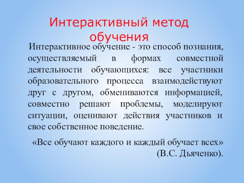 способ познания, осуществляемый в формах совместной деятельности обучающихся: все участники образовательного процесса взаимодействуют друг с другом, обмениваются информацией, совместно решают проблемы, моделируют ситуации, оценивают действия участников и свое собственное поведение.