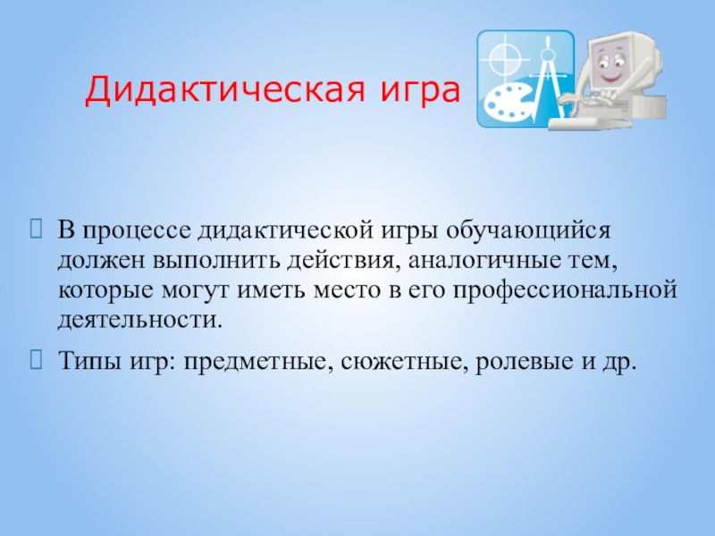 В процессе дидактической игры обучающийся должен выполнить действия, аналогичные тем,