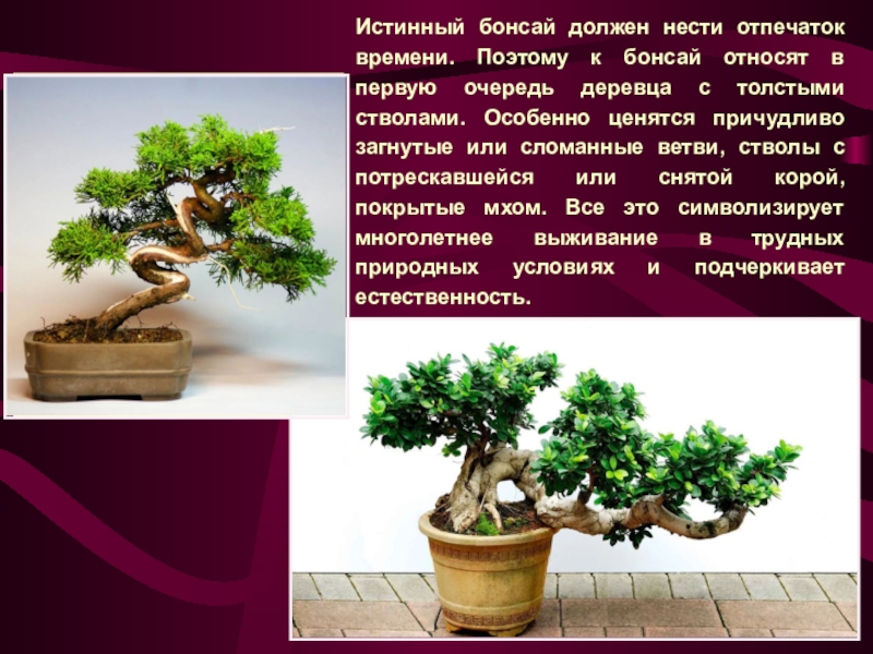 Слайд 5Истинный бонсай должен нести отпечаток времени. Поэтому к бонсай относят в