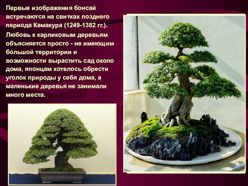 Слайд 3Первые изображения бонсай встречаются на свитках позднего периода Камакура (1249-1382 гг.).