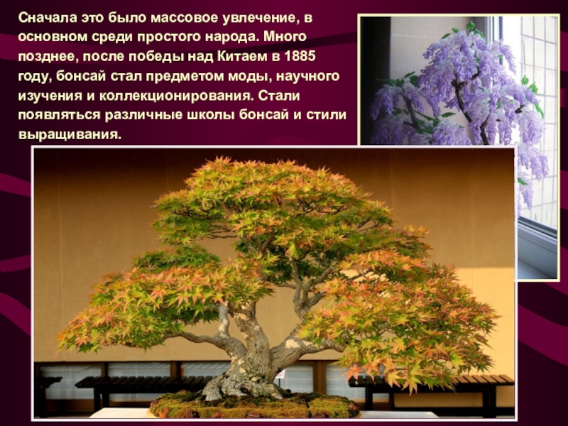 позднее, после победы над Китаем в 1885 году, бонсай стал предметом моды, научного изучения и коллекционирования. Стали появляться различные школы бонсай и стили выращивания.