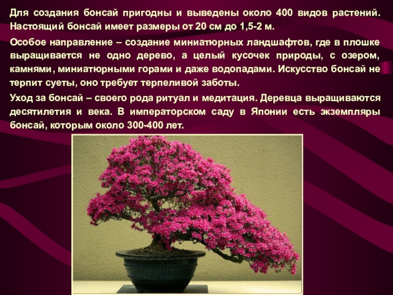 Слайд 8Для создания бонсай пригодны и выведены около 400 видов растений. Настоящий