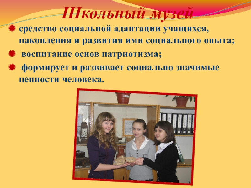 Школьный музейсредство социальной адаптации учащихся, накопления и развития ими социального опыта; воспитание основ патриотизма; формирует и развивает