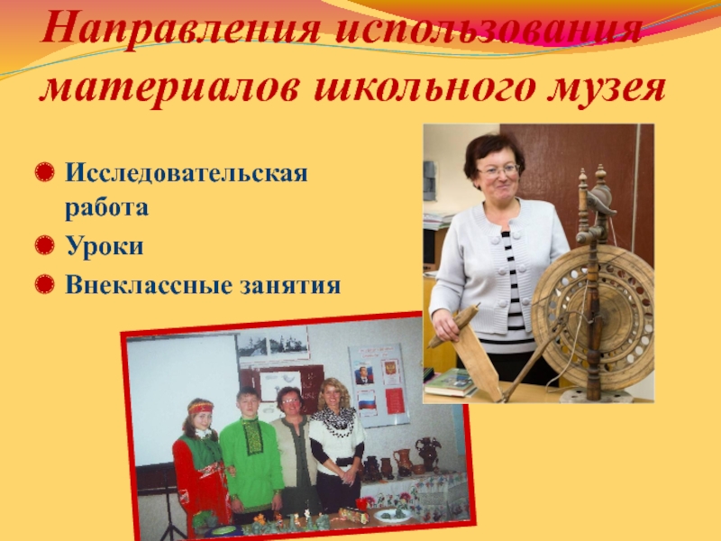 Направления использования материалов школьного музея Исследовательская работаУрокиВнеклассные занятия