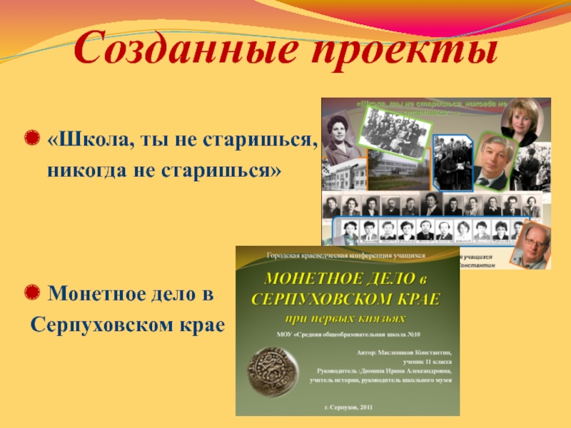 Созданные проекты «Школа, ты не старишься,  никогда не старишься»Монетное дело в Серпуховском крае