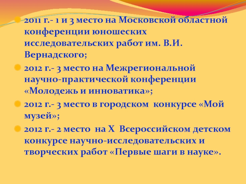 2011 г.- 1 и 3 место на Московской областной конференции юношеских исследовательских работ им. В.И. Вернадского;2012 г.-