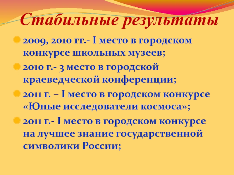 Стабильные результаты2009, 2010 гг.- I место в городском конкурсе школьных музеев;2010 г.- 3 место в городской краеведческой