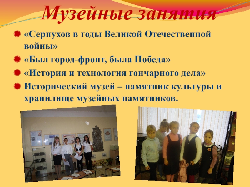 Музейные занятия«Серпухов в годы Великой Отечественной войны»«Был город-фронт, была Победа»«История и технология гончарного дела»Исторический музей – памятник