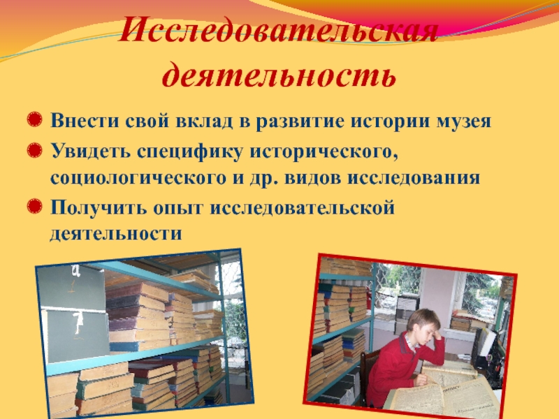 Исследовательская деятельностьВнести свой вклад в развитие истории музеяУвидеть специфику исторического, социологического и др. видов исследованияПолучить опыт исследовательской