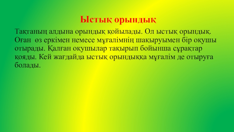 Тақтаның алдына орындық қойылады. Ол ыстық орындық. Оған өз еркімен