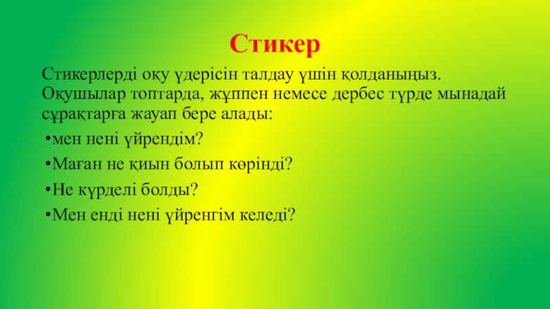 Стикерлерді оқу үдерісін талдау үшін қолданыңыз. Оқушылар топтарда, жұппен немесе дербес
