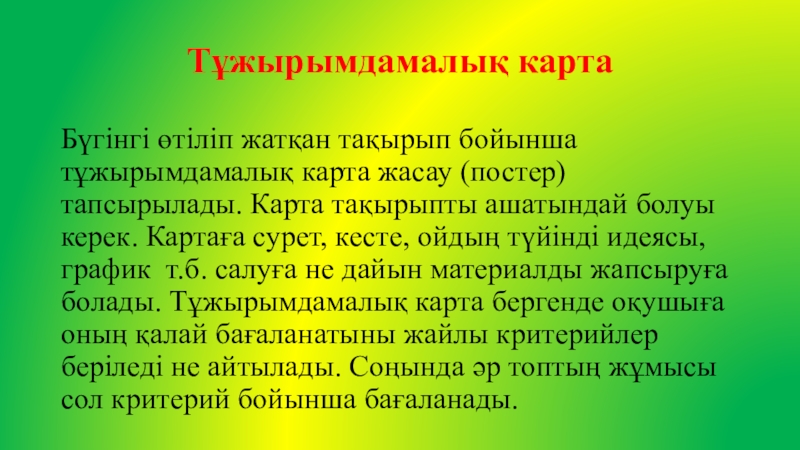 Бүгінгі өтіліп жатқан тақырып бойынша тұжырымдамалық карта жасау (постер) тапсырылады.