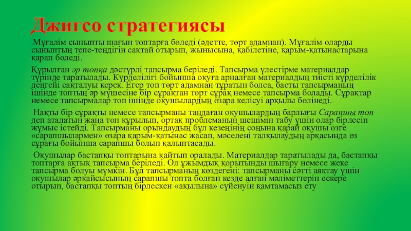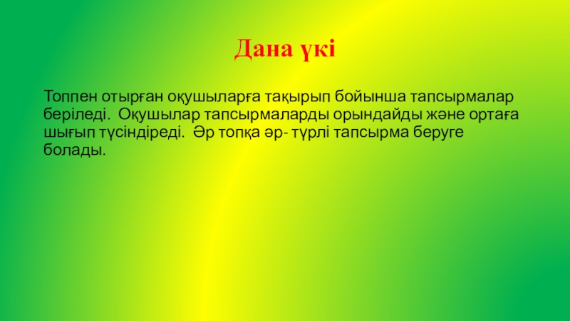 және ортаға шығып түсіндіреді. Әр топқа әр- түрлі тапсырма беруге болады.