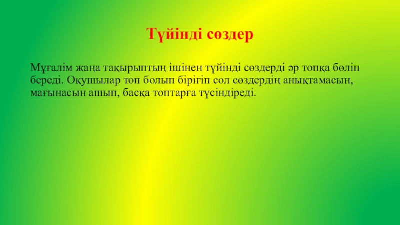 Мұғалім жаңа тақырыптың ішінен түйінді сөздерді әр топқа бөліп