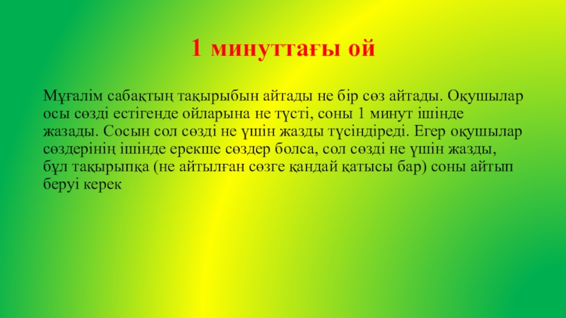 осы сөзді естігенде ойларына не түсті, соны 1 минут ішінде жазады. Сосын сол сөзді не үшін жазды түсіндіреді. Егер оқушылар сөздерінің ішінде ерекше сөздер болса, сол сөзді не үшін жазды, бұл тақырыпқа (не айтылған сөзге қандай қатысы бар) соны айтып беруі керек