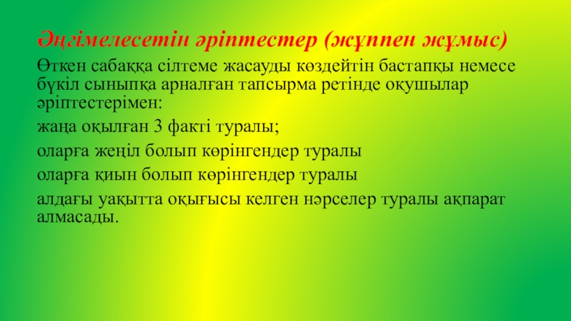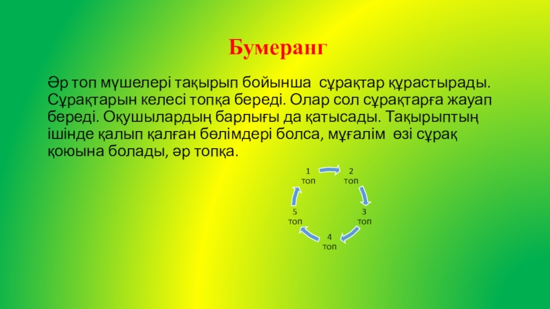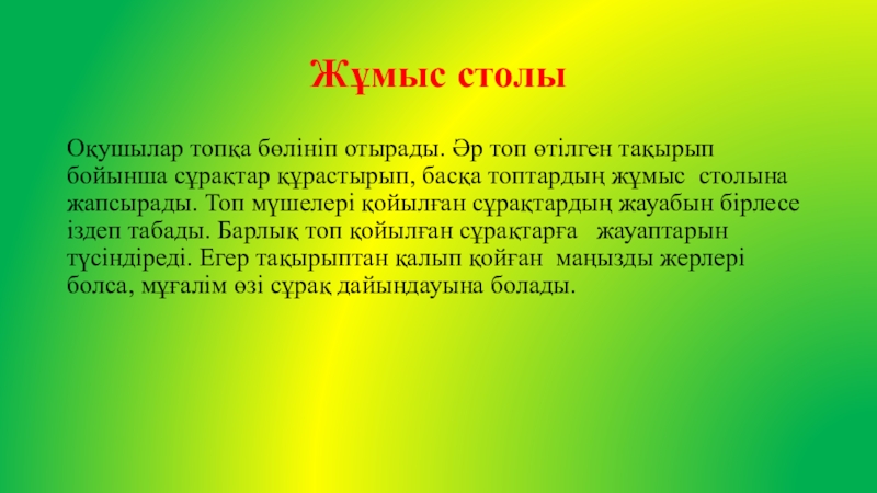 береді. Олар сол сұрақтарға жауап береді. Оқушылардың барлығы да қатысады. Тақырыптың ішінде қалып қалған бөлімдері болса, мұғалім өзі сұрақ қоюына болады, әр топқа.