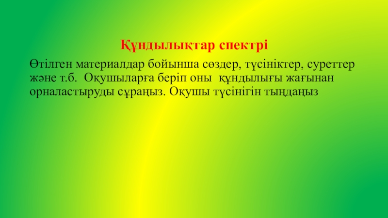 Өтілген материалдар бойынша сөздер, түсініктер, суреттер және т.б. Оқушыларға беріп