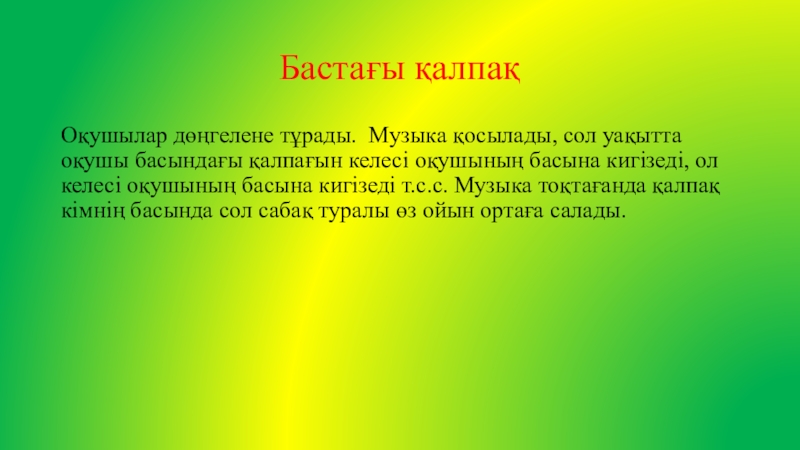 келесі оқушының басына кигізеді, ол келесі оқушының басына кигізеді т.с.с. Музыка тоқтағанда қалпақ кімнің басында сол сабақ туралы өз ойын ортаға салады.