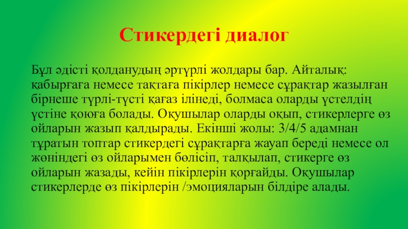 пікірлер немесе сұрақтар жазылған бірнеше түрлі-түсті қағаз ілінеді, болмаса оларды үстелдің үстіне қоюға болады. Оқушылар оларды оқып, стикерлерге өз ойларын жазып қалдырады. Екінші жолы: 3/4/5 адамнан тұратын топтар стикердегі сұрақтарға жауап береді немесе ол жөніндегі өз ойларымен бөлісіп, талқылап, стикерге өз ойларын жазады, кейін пікірлерін қорғайды. Оқушылар стикерлерде өз пікірлерін /эмоцияларын білдіре алады.