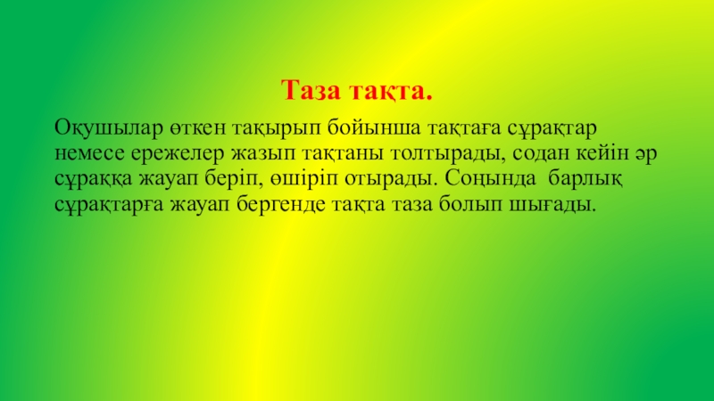 Оқушылар өткен тақырып бойынша тақтаға сұрақтар немесе ережелер жазып тақтаны