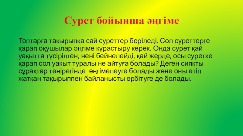 әңгіме құрастыру керек. Онда сурет қай уақытта түсірілген, нені бейнелейді, қай жерде, осы суретке қарап сол уақыт туралы не айтуға болады? Деген сияқты сұрақтар төңірегінде әңгімелеуге болады және оны өтіп жатқан тақырыппен байланысты өрбітуге де болады.