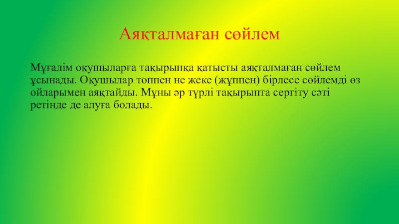 жеке (жұппен) бірлесе сөйлемді өз ойларымен аяқтайды. Мұны әр түрлі тақырыпта сергіту сәті ретінде де алуға болады.