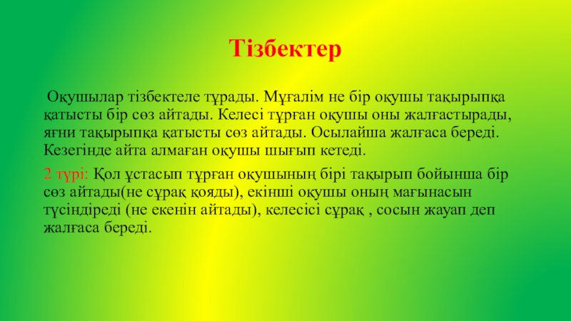 сөз айтады. Келесі тұрған оқушы оны жалғастырады, яғни тақырыпқа қатысты сөз айтады. Осылайша жалғаса береді. Кезегінде айта алмаған оқушы шығып кетеді.
