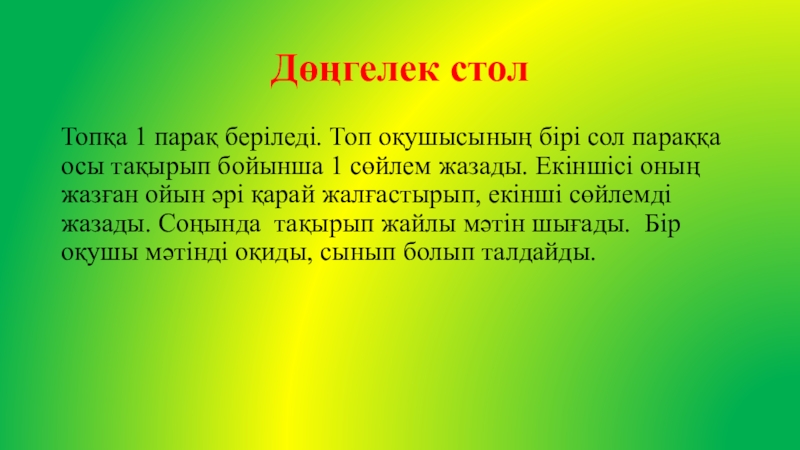 осы тақырып бойынша 1 сөйлем жазады. Екіншісі оның жазған ойын әрі қарай жалғастырып, екінші сөйлемді жазады. Соңында тақырып жайлы мәтін шығады. Бір оқушы мәтінді оқиды, сынып болып талдайды.