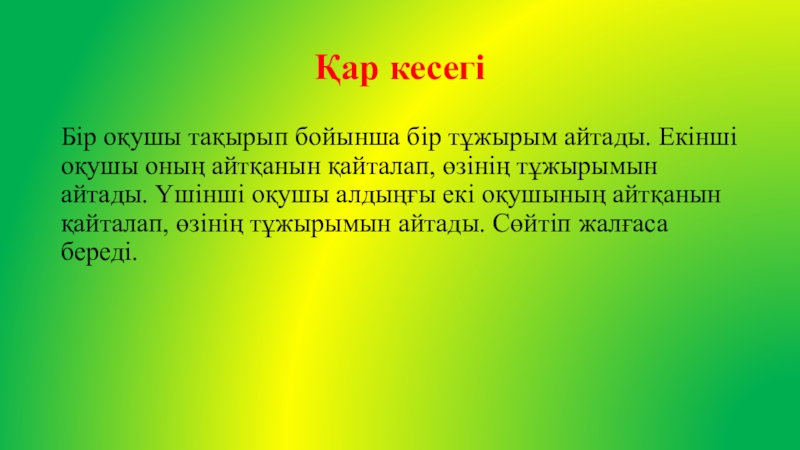 айтқанын қайталап, өзінің тұжырымын айтады. Үшінші оқушы алдыңғы екі оқушының айтқанын қайталап, өзінің тұжырымын айтады. Сөйтіп жалғаса береді.