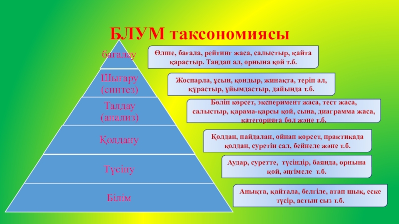 Бөліп көрсет, эксперимент жаса, тест жаса, салыстыр, қарама-қарсы қой, сына, диаграмма жаса, категорияға бөл және т.б.