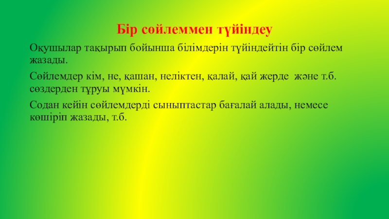 Оқушылар тақырып бойынша білімдерін түйіндейтін бір сөйлем жазады.