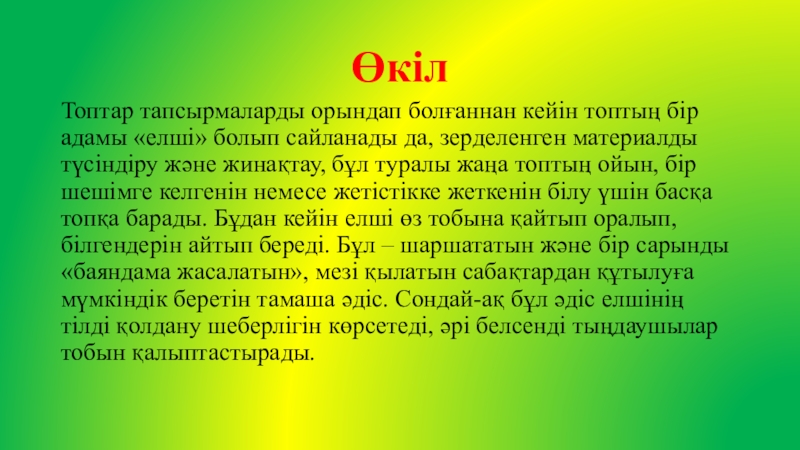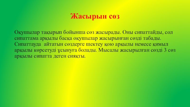 Оқушылар тақырып бойынша сөз жасырады. Оны сипаттайды, сол сипаттама арқылы