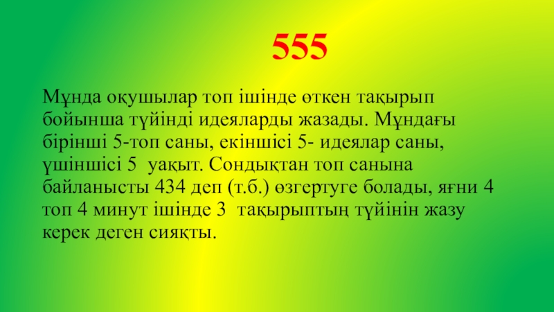Мұндағы бірінші 5-топ саны, екіншісі 5- идеялар саны, үшіншісі 5 уақыт. Сондықтан топ санына байланысты 434 деп (т.б.) өзгертуге болады, яғни 4 топ 4 минут ішінде 3 тақырыптың түйінін жазу керек деген сияқты.