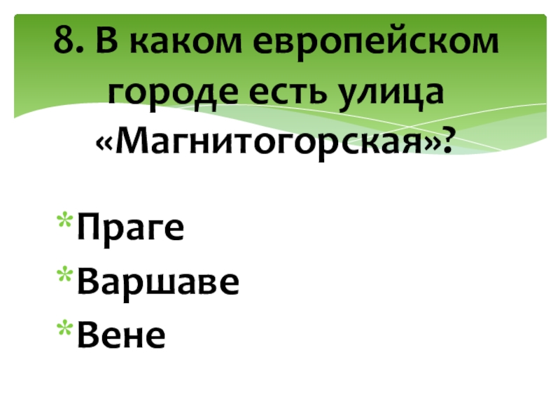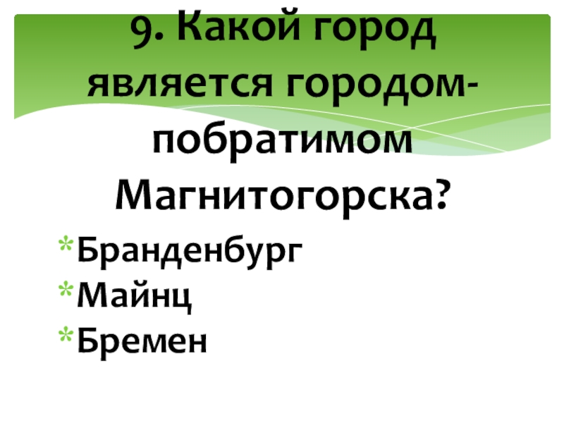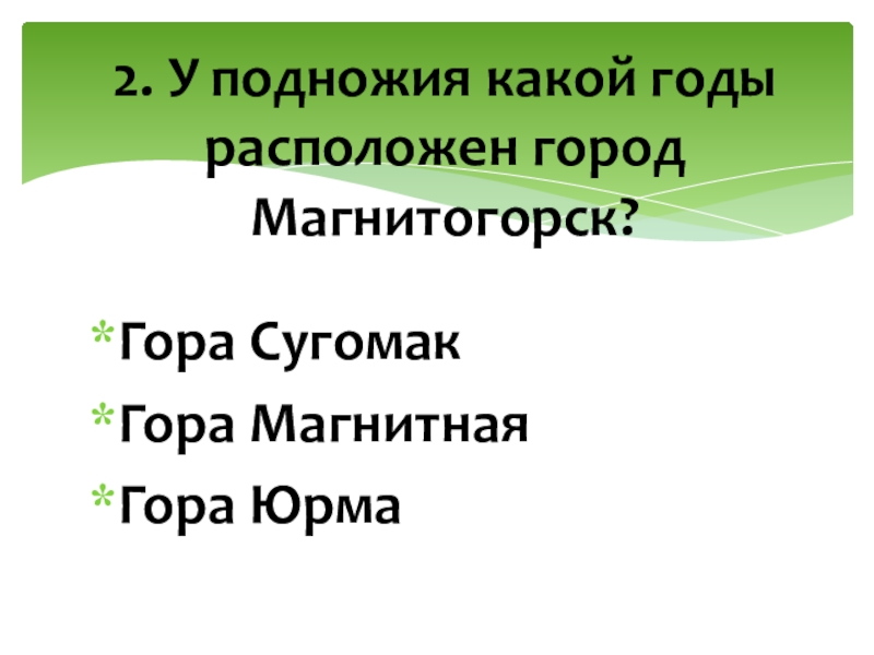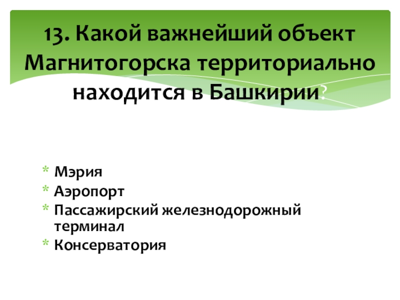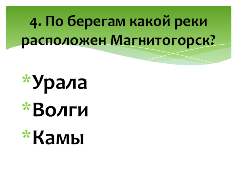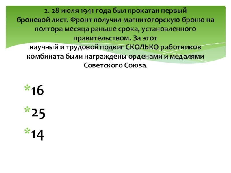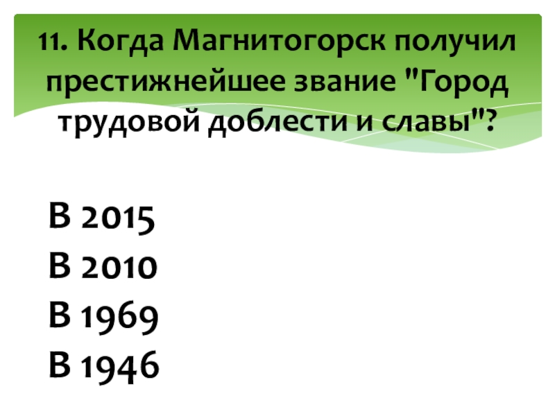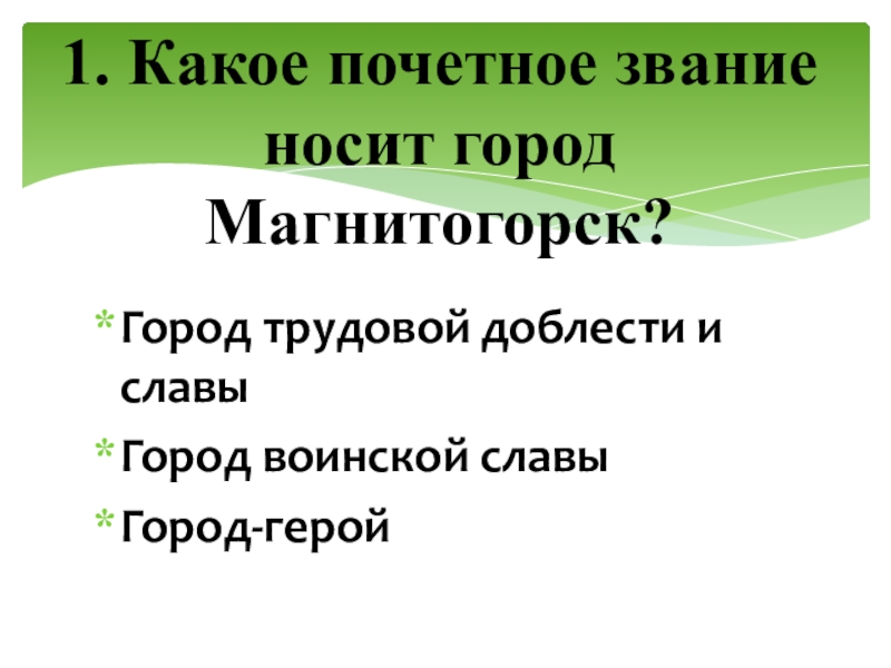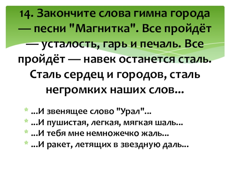 14. Закончите слова гимна города — песни "Магнитка". Все пройдёт — усталость, гарь и печаль. Все пройдёт — навек останется сталь. Сталь сердец и городов, сталь негромких наших слов...