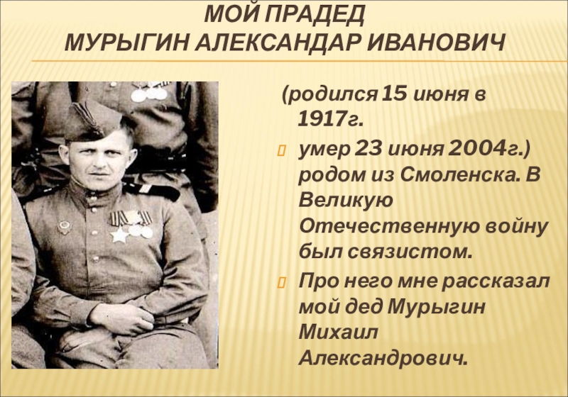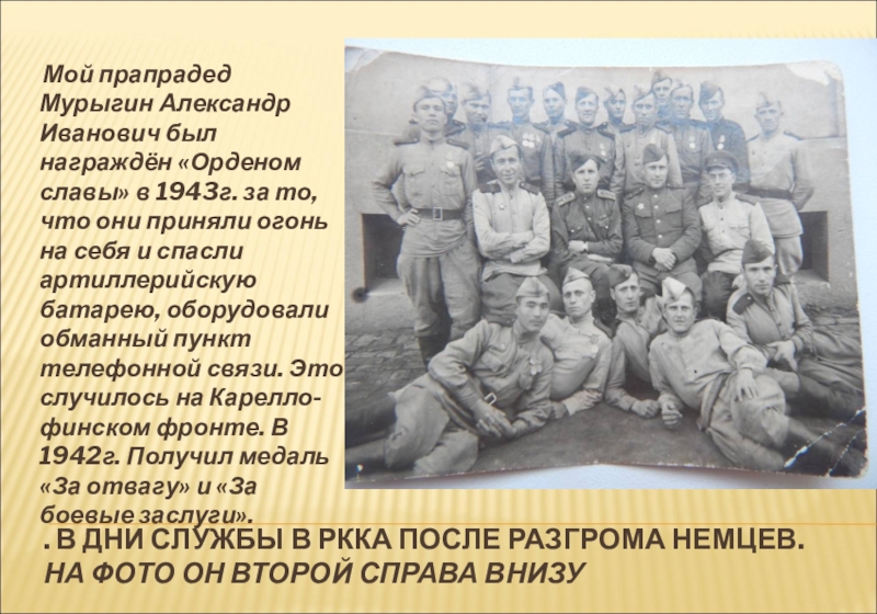 Мой прапрадед Мурыгин Александр Иванович был награждён «Орденом славы» в 1943г. за то, что они приняли огонь на себя и спасли артиллерийскую батарею, оборудовали обманный пункт телефонной связи. Это случилось на Карелло-финском фронте. В 1942г. Получил медаль «За отвагу» и «За боевые заслуги».