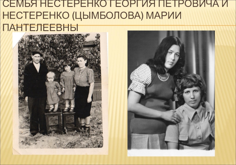 Слайд 7СЕМЬЯ НЕСТЕРЕНКО ГЕОРГИЯ ПЕТРОВИЧА И НЕСТЕРЕНКО (ЦЫМБОЛОВА) МАРИИ ПАНТЕЛЕЕВНЫ