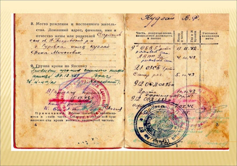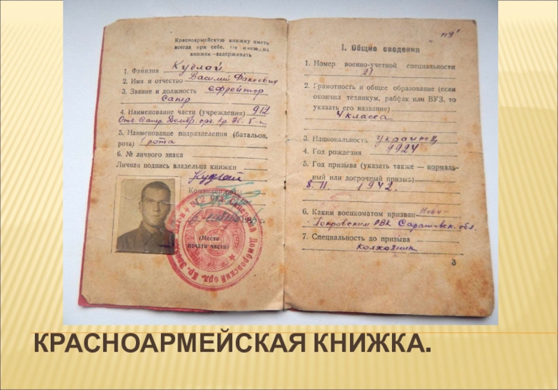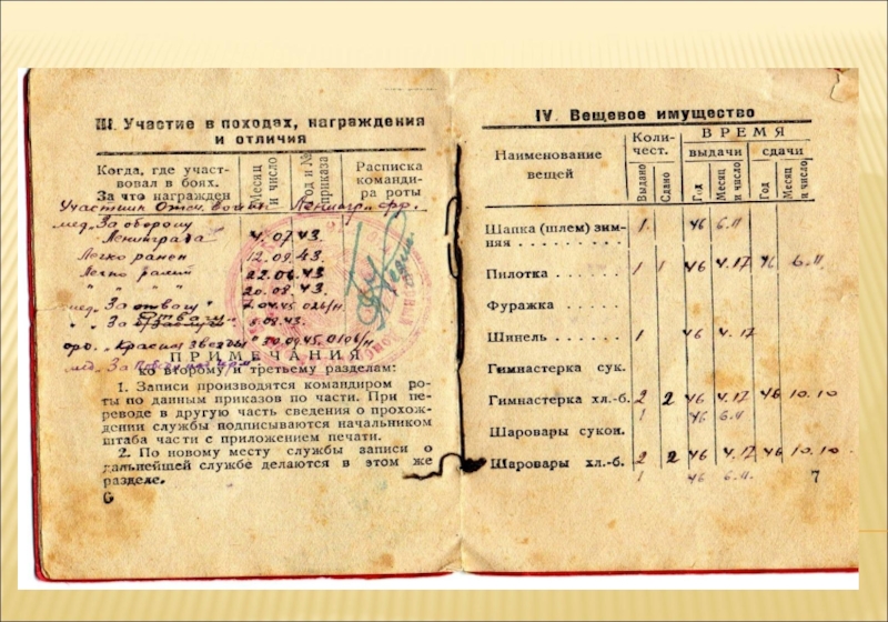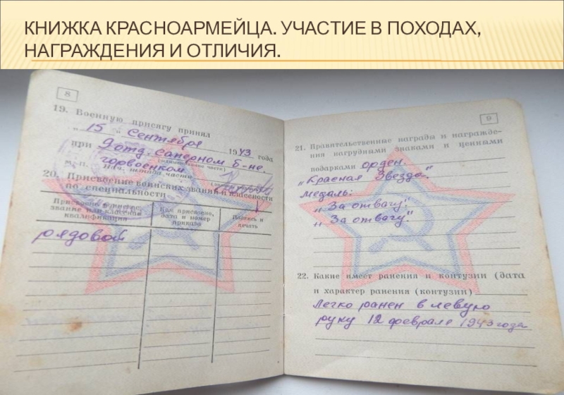 Слайд 39КНИЖКА КРАСНОАРМЕЙЦА. УЧАСТИЕ В ПОХОДАХ, НАГРАЖДЕНИЯ И ОТЛИЧИЯ.