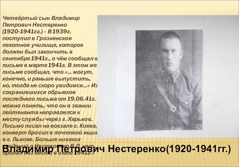 Грозненское пехотное училище, которое должен был закончить в сентябре 1941г., о чём сообщал в письме в марте 1941г. В этом же письме сообщал, что «... могут, конечно, и раньше выпустить, но, тогда не скоро увидимся...» Из сохранившихся обрывков последнего письма от 19.06.41г. можно понять, что он в звании лейтенанта направлялся к месту службы через г. Харьков. Письмо писал на вокзале г. Киева, конверт бросил в почтовой ящик в г. Львове. Больше никаких сведений о Нестеренко В.П. нет,, пропал без вести в июле 1941г.»