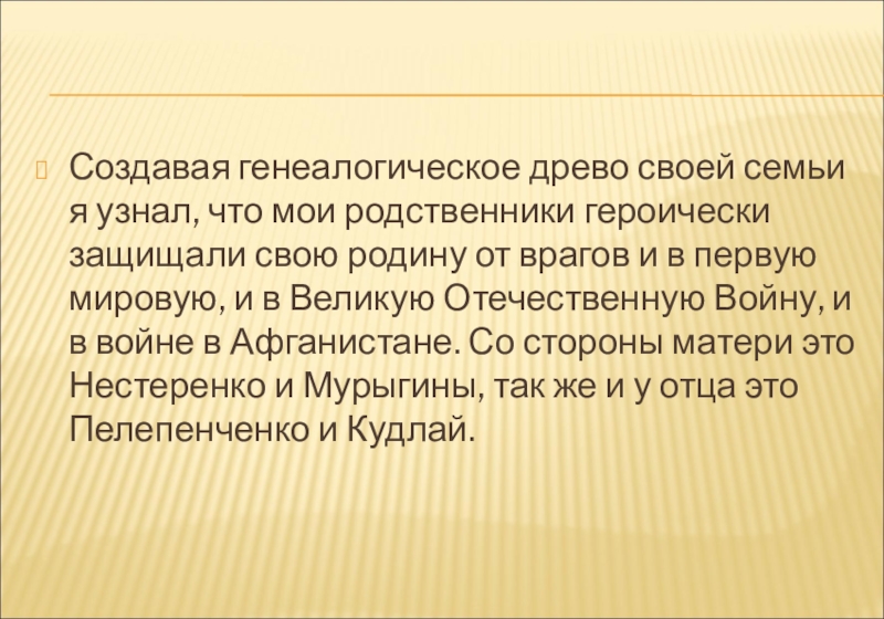 защищали свою родину от врагов и в первую мировую, и в Великую Отечественную Войну, и в войне в Афганистане. Со стороны матери это Нестеренко и Мурыгины, так же и у отца это Пелепенченко и Кудлай.