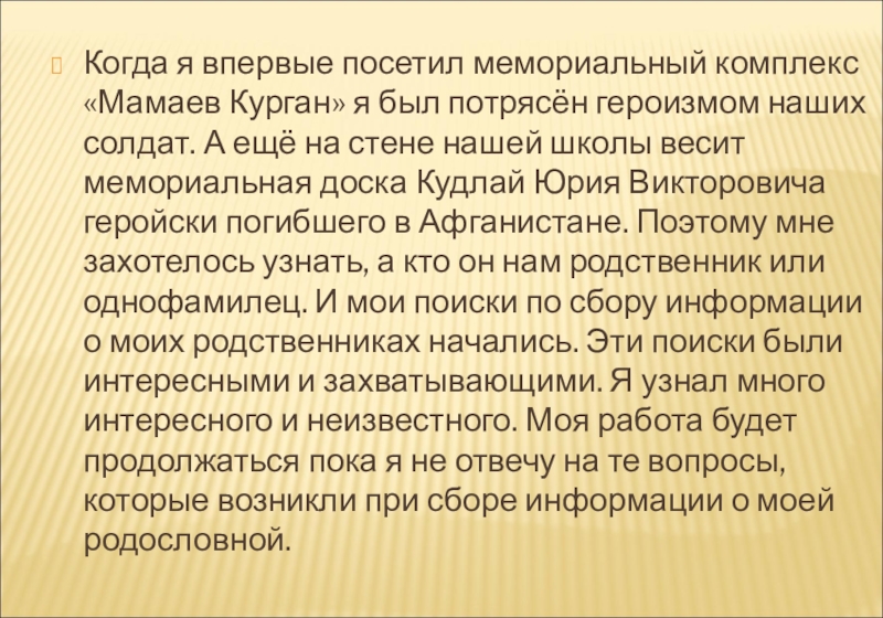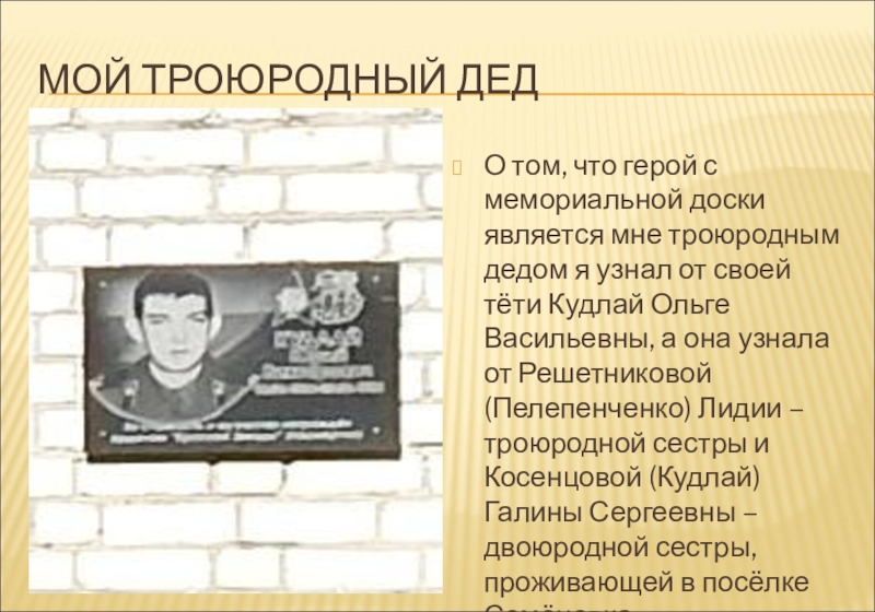 героизмом наших солдат. А ещё на стене нашей школы весит мемориальная доска Кудлай Юрия Викторовича геройски погибшего в Афганистане. Поэтому мне захотелось узнать, а кто он нам родственник или однофамилец. И мои поиски по сбору информации о моих родственниках начались. Эти поиски были интересными и захватывающими. Я узнал много интересного и неизвестного. Моя работа будет продолжаться пока я не отвечу на те вопросы, которые возникли при сборе информации о моей родословной.