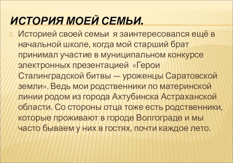когда мой старший брат принимал участие в муниципальном конкурсе электронных презентацией «Герои Сталинградской битвы — уроженцы Саратовской земли». Ведь мои родственники по материнской линии родом из города Ахтубинска Астраханской области. Со стороны отца тоже есть родственники, которые проживают в городе Волгограде и мы часто бываем у них в гостях, почти каждое лето.