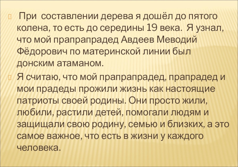 до середины 19 века. Я узнал, что мой прапрапрадед Авдеев Меводий Фёдорович по материнской линии был донским атаманом.