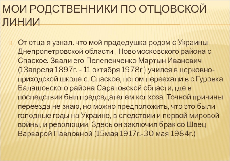 родом с Украины Днепропетровской области , Новомосковского района с. Спаское. Звали его Пелепенченко Мартын Иванович (13апреля 1897г. - 11 октября 1978г.) учился в церковно-приходской школе с. Спаское, потом переехали в с.Гуровка Балашовского района Саратовской области, где в последствии был председателем колхоза. Точной причины переезда не знаю, но можно предположить, что это были голодные годы на Украине, в следствии и первой мировой войны, и революции. Здесь он заключил брак со Швец Варварой Павловной (15мая 1917г.-30 мая 1984г.)