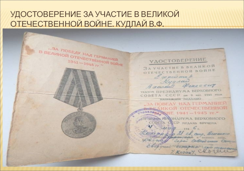 Слайд 40УДОСТОВЕРЕНИЕ ЗА УЧАСТИЕ В ВЕЛИКОЙ ОТЕЧЕСТВЕННОЙ ВОЙНЕ. КУДЛАЙ В.Ф.