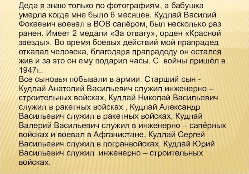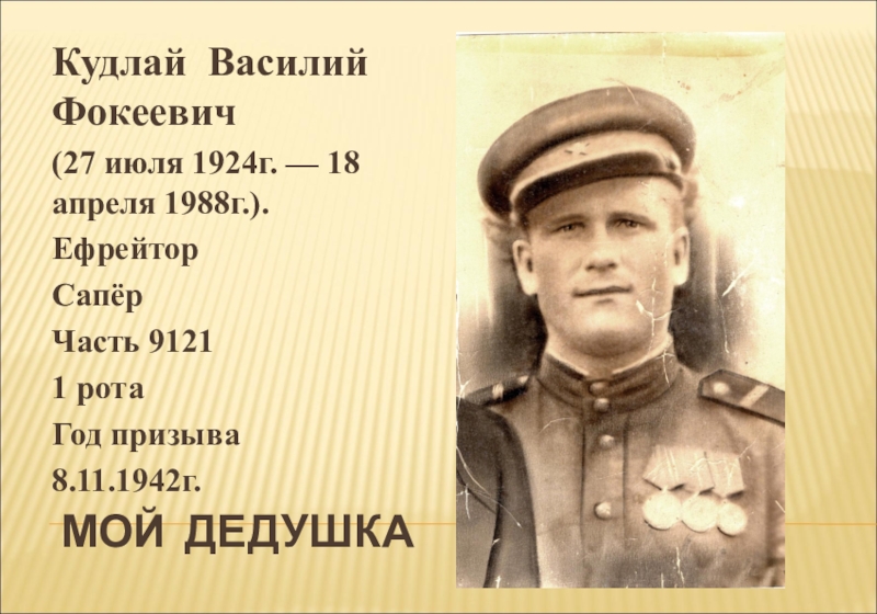 было 6 месяцев. Кудлай Василий Фокеевич воевал в ВОВ сапёром, был несколько раз ранен. Имеет 2 медали «За отвагу», орден «Красной звезды». Во время боевых действий мой прапрадед откапал человека, благодаря прапрадеду он остался жив и за это он ему подарил часы. С войны пришёл в 1947г..